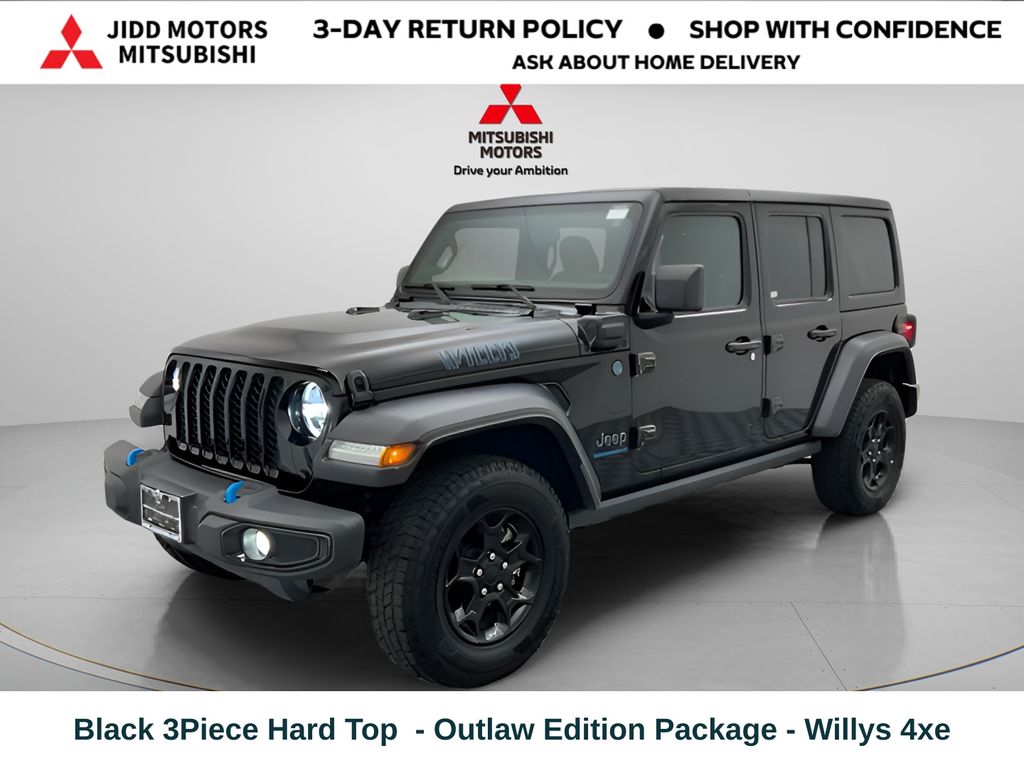 The 2023 Jeep Wrangler Willys 4xe brings together the rugged heritage of the Willys edition with the innovation of plug-in hybrid power. Its 2.0L turbocharged PHEV system delivers instant torque, impressive efficiency, and the flexibility of driving in hybrid or electric mode. Trail Rated 4x4 capability, heavy-duty Dana axles, mud-terrain tires, and the Selec-Trac full-time transfer case make it ready for serious off-road adventures. Inside, the Willys 4xe blends comfort and tech with premium cloth seating, Uconnect with a large touchscreen, Apple CarPlay, Android Auto, and available Alpine premium audio. The open-air freedom of removable doors and roof panels lets you fully enjoy every adventure, while advanced safety features like Blind Spot Monitoring, Adaptive Cruise Control, and ParkView rear camera provide added confidence. The 2023 Jeep Wrangler Willys 4xe is the perfect mix of classic Jeep toughness and modern hybrid innovation. Now available at Jidd Motors Mitsubishi, 1313 Rand Rd, Des Plaines, IL 60016.
