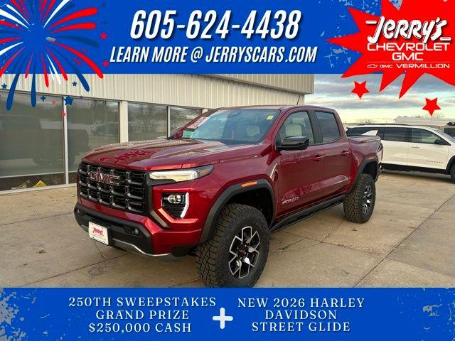2026 GMC Canyon 4D Crew Cab Volcanic Red Tintcoat 4WD 2.7L I4 Turbocharged DOHC 16V LEV3-SULEV30 310hp AT4 8-Speed Automatic The 2026 GMC Canyon AT4 is purpose-built for the off-road enthusiast who demands both rugged capability and premium comfort. It's the ideal mid-size truck for drivers whose weekends involve leaving the pavement behind, 4WD, 120-Volt Bed Mounted Power Outlet, 2 1st Row USB Charge/Data Ports, 6-Speaker Audio System Feature, 6-Way Power Passenger Seat Adjuster, 8-Way Power Driver Seat Adjuster, Adaptive Cruise Control, AT4 Premium Package, Auto High-beam Headlights, Canyon Safety Plus Package, Driver Memory, Driver Seatback Map Pocket, HD Surround Vision, Heated door mirrors, Heated Steering Wheel, Multicolor 6.3 Diagonal Head-Up Display, Power Passenger Lumbar Control Seat Adjuster, Premium 7-Speaker Bose Sound System, Rear Cross Traffic Braking, Ultrasonic Rear Park Assist, Wireless Apple CarPlay/Wireless Android Auto, Wireless Phone Charging. *Not all buyers will qualify for all rebates. Residency restrictions apply. See dealer for details. Visit us today at Jerrys in Vermillion to check out our great selection of vehicles or call one of our sales professionals at 605-624-4438 to schedule a test drive..