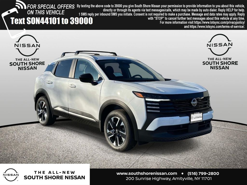 Fresh Powder 2026 Nissan Kicks SV AWD CVT with Xtronic 2.0L DOHC 17" Alloy Wheels, 4 Speakers, 4-Wheel Disc Brakes, ABS brakes, Air Conditioning, Alloy wheels, AM/FM radio, Auto High-beam Headlights, Automatic temperature control, AWD Cargo Mat, Blind Spot Warning, Brake assist, Bumpers: body-color, Cargo Blocks, Carpeted Floor Mats, Charging Package, Cloth Seat Trim, Cold Weather Package, Crossbars, Dash Cam - Dual Camera Drive Recorder, Door Pocket Light, Door Trim Panel Scuff Plates, Driver door bin, Driver vanity mirror, Dual front impact airbags, Dual front side impact airbags, Electronic Stability Control, Emergency communication system, Exterior Ground Lighting w/Logo, Exterior Parking Camera Rear, Four wheel independent suspension, Front anti-roll bar, Front Bucket Seats, Front Center Armrest, Front reading lights, Fully automatic headlights, Heated Front Seats, Heated Mirrors, Illuminated Cargo Scuff Plate, Illuminated Driver & Passenger Sun Visors, Illuminated entry, Illuminated Kickplates, Illumination Package, Interior Ambient Lighting, Interior Electronics Package, Knee airbag, Low tire pressure warning, NissanConnect featuring Apple CarPlay and Android Auto, Occupant sensing airbag, Outside temperature display, Overhead airbag, Panic alarm, Panoramic Headliner Illumination, Panoramic Moonroof, Passenger door bin, Passenger vanity mirror, Power door mirrors, Power steering, Power windows, Radio data system, Radio: AM/FM/SiriusXM Audio System, Rear anti-roll bar, Rear Floor Heater Ducts, Rear reading lights, Rear side impact airbag, Rear window defroster, Rear window wiper, Remote keyless entry, Security system, Speed control, Speed-sensing steering, Splash Guards, Split folding rear seat, Spoiler, Sport steering wheel, Steering wheel mounted audio controls, Sunglass Holder, SV Premium Package, Tachometer, Telescoping steering wheel, Tilt steering wheel, Traction control, Trip computer, USB Charging Cable Set - Nissan, USB-C Power Delivery, Variably intermittent wipers. Recent Arrival! 27/34 City/Highway MPG
