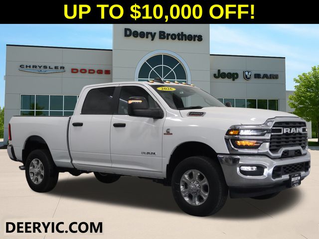 Bed Convenience Group (LED Bed Lighting and MOPAR Spray in Bedliner), Quick Order Package 2UA Tradesman, Tradesman Level 2 Equipment Group (115-Volt Auxiliary Front Power Outlet, 12" Touchscreen Display, 4 Way Front Headrests, 40/20/40 Split Bench Seat, 400W Inverter, 4G LTE Wi-Fi Hot Spot, 6 Speakers, Air Conditioning with Dual Zone Control, Alexa Built-in, Anti-Spin Differential Rear Axle, Apple CarPlay, Auto-Dimming Rear-View Mirror, Black Exterior Mirrors, Bright Front Bumper, Bright Rear Bumper, Carpet Floor Covering, Center Hub, Chrome Grille Surround, Cloth 40/20/40 Bench Seat, Connected Travel and Traffic Services, Connectivity - US/Canada, Convenience Group, Disassociated Touchscreen Display, Emergency Vehicle Alert System (EVAS), Exterior 115V AC Outlet, Exterior Mirrors Courtesy Lamps, Exterior Mirrors with Heating Element, Exterior Mirrors with Supplemental Signals, For Details Visit DriveUconnect.com, For More Info Call 800-643-2112, Front 1-Touch Down Power Windows, Front Armrest with Cupholders, Front Floor Mats, Global Telematics Box Module, Google Android Auto, GPS Antenna Input, GPS Navigation, HD Radio, Integrated Voice Command with Bluetooth, Manual Adjust 4-Way Driver Seat, Manual Adjust 4-Way Front Passenger Seat, Manual Folding Exterior Mirrors, Matte Black Mesh with Chrome Grille, Mirror Running Lights, Mopar Black Tubular Side Steps, Off-Road Info Pages, ParkSense Front/Rear Park Assist System, Power Adjust Mirrors, Power Heated Folding Telescopic Mirrors, Power-Adjustable Convex Aux Mirrors, Radio: Uconnect 5 Navigation with 12.0" Display, Rear Sliding Window, Remote Keyless Entry, Remote USB Port - Charge Only, Selectable Tire Fill Alert, SiriusXM Radio Service, SiriusXM with 360L, Speed Sensitive Power Locks, Tinted Acoustic Windshield Glass, Trailer Tow Pages, Upgraded Door Trim Panel, and Wheels: 18" x 8.0" Steel Chrome Clad), 3.73 Axle Ratio, 4 Speakers, 4-Wheel Disc Brakes, ABS brakes, Air Conditioning, AM/FM radio: SiriusXM, Apple CarPlay/Android Auto, Black Wheel Center Hub, Brake assist, Clearance Lamps, Compass, Dash Pass Thru Wire Circuits, Delay-off headlights, Driver door bin, Dual front impact airbags, Dual front side impact airbags, Electronic Stability Control, Front anti-roll bar, Front Center Armrest w/Storage, Front fog lights, Front License Plate Bracket, Front reading lights, Fully automatic headlights, Heavy Duty Vinyl 40/20/40 Split Bench Seat, Illuminated entry, Instrument Panel Mounted Auxiliary Switches, Low tire pressure warning, Manufacturer's Statement of Origin, MyFlexCare Service Plan, Occupant sensing airbag, Outside temperature display, Overhead airbag, Overhead console, ParkView Rear Back-Up Camera, Passenger door bin, Passenger vanity mirror, Power steering, Radio data system, Radio: Uconnect 5 with 8.4" Display, Rear anti-roll bar, Rear step bumper, Speed control, Tachometer, Tilt steering wheel, Traction control, Variably intermittent wipers, Voltmeter, and Wheels: 17" x 7.5" Black Steel StyleD. Bright White Clearcoat 2026 Ram 2500 Tradesman 2D Standard Cab 6.4L V8 8-Speed Automatic 4WD Price does not include Taxes, Tags, License, & Fees. Not all customers qualify for all rebates.$1000 - 2026 National Bonus Cash . Exp. 04/30/2026 $1,000 Deery Trade In Bonus Cash. Must have a qualified trade in. See Dealer for details. 2026On-The-Job $500 Commercial Equipment/Upfit. May not be able to combine with other offers. Not everybody will qualify. See dealer for details.