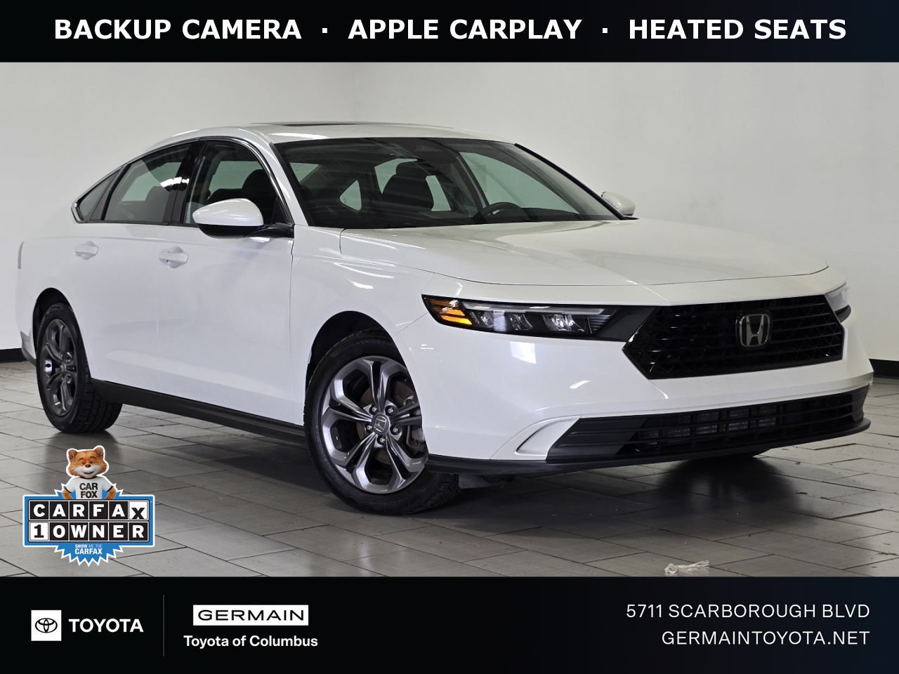 This CARFAX 1-owner vehicle is available now at Germain Toyota! This2023 Honda Accord EX car for sale is loaded with Desirable features like: BACKUP CAMERA, ANDROID AUTO, APPLE CARPLAY, HEATED SEATS, ALLOY-WHEELS, BLUETOOTH, MULTI-ZONE AC. Technology and Entertainment Features Include: Apple CarPlay Capable, Android Auto by Google, Bluetooth Connection, Keyless Entry Safety and Economy Features Include: Back-Up Camera, Lane Departure Warning, Electronic Stability Control, Lane Keeping Assist System, Aftermarket Anti Theft System, Security System, Emergency SOS system, Brake Assist, Adaptive Cruise Control, Speed Sensitive Power Steering, Overhead airbag, Auto Highbeams, Knee AirBag, Tire Pressure Monitoring System, Dual Air Bags, ABS Brakes, Delay-off headlights, Driver Front Side Impact Air Bag, Low tire pressure warning, Passenger Air Bag Sensor This vehicle has an EPA rated fuel economy of 37.0 highway / 29.0 city<sup>1</sup>. Germain Toyota of Columbus proudly offers our customers Toyota Express Maintenance. <a href="https://www.germaintoyota.net/service/toyota-express-maintenance/" target="_blank">Toyota Express Maintenance</a>! Express Maintenance includes Oil & Filter Change, Brake Inspection, Tire Rotation, Multi-Point Inspection, and Fluid Inspection. Our pit crew-inspired approach helps get you in and out quickly. All at the right price, with quality you expect from your Toyota dealer. Our dealership is conveniently located at 5711 Scarborough Blvd in Columbus, Ohio. We proudly serve the communities of Reynoldsburg, Pickerington, Westerville, and Grove City. Toyota Finance Center We're eager to provide financing for your next used car, assist in used car financing, and even work with those with bad or no credit auto financing. Our Columbus, OH Buying Center will also give you top-dollar for your trade with a competitive real-time offer! With our live market pricing, most vehicles sell within the first few weeks, so please contact us ahead of time at (614) 412-1805. This vehicle is available for a test drive most days of the week, but we suggest reaching out to us beforehand to make sure it is out front and ready for you when you arrive. We also offer free airport pickup. <i>Germain Toyota: The Right Car. The Right Price. The Right Way.</i> <sup>1</sup>Based on EPA mileage ratings. Use for comparison purposes only. Your mileage will vary depending on driving conditions, how you drive and maintain your vehicle, etc.