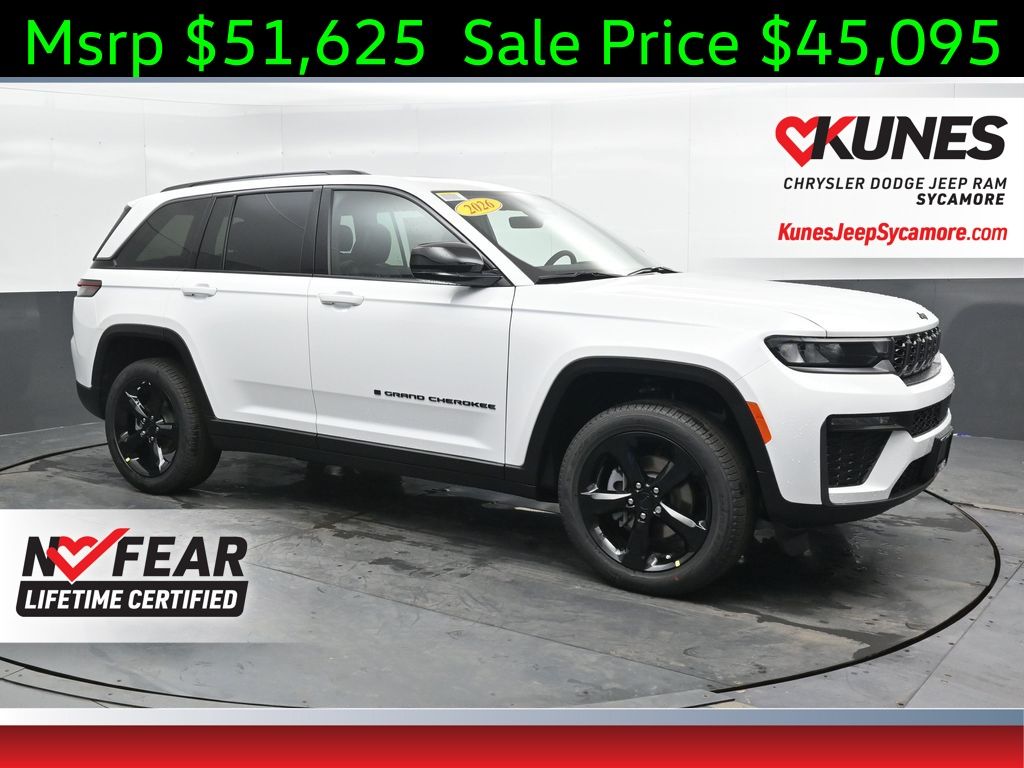 2026 Jeep Grand Cherokee Laredo 4WD 8-Speed Automatic 2.0L V6 SMPI Turbocharged DOHC 24V LEV3-SULEV30 293hp 19/26 City/Highway MPG At Kunes Chrysler Dodge Jeep RAM of Sycamore, we believe in faith, family, and giving back to the communities we are a part of. We also stand by our belief that we will only provide you with the best service we can, and we will make every effort to make everything right for you. Our aggressive financial team works hard to find the best solution to your credit situation. They have worked with all types of credit from "the skies the limit" credit to "why me" credit. They will optimize all options to meet your needs and get you in the vehicle of your dreams! Sale prices are contingent with financing. While we make every effort to ensure the data listed here is correct, there may be instances where some of the factory rebates, incentives, options or vehicle features may be listed incorrectly as we get data from multiple data sources. PLEASE MAKE SURE to confirm the details of the vehicle with the dealer to ensure its accuracy. Dealer reserves the right to correct any pricing error prior to final sale. Prices shown do not include taxes, license, and title fees and a $377.63 documentary service fee. Price includes: $1500 - 2026 National Retail Bonus Cash . Exp. 04/30/2026