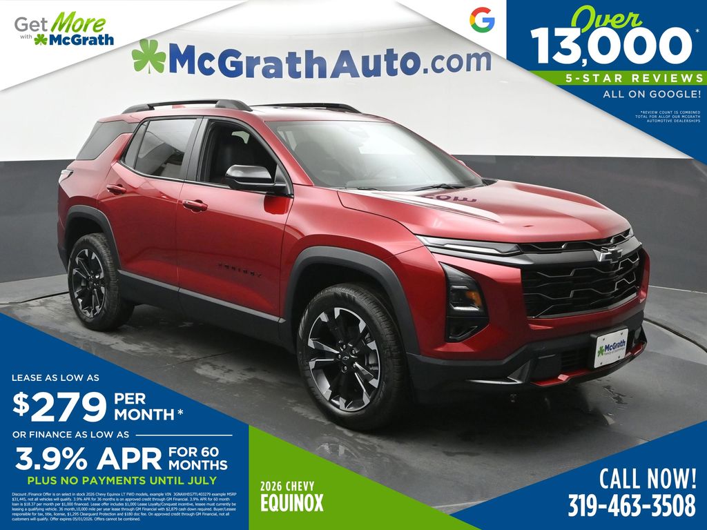 Discover the 2026 Chevrolet Equinox RS - a remarkable SUV that combines sleek style, advanced technology, and exceptional performance. This stunning model in Blue boasts a powerful 1.5L DOHC engine paired with an 8-Speed Automatic transmission and All-Wheel Drive, delivering an impressive 25 city / 29 highway MPG. Elevate your driving experience with an impressive array of premium features, including: Navigation System Convenience Package III 6 Speakers AM/FM radio: SiriusXM Premium audio system: Chevrolet Infotainment 3 And much more Indulge in the comfort and convenience of dual-zone automatic climate control, a power driver's seat, and a heated steering wheel. Stay connected with the 11.3" Diagonal Advanced Color LCD Display and OnStar® & Chevrolet connected services. Designed for both style and substance, the Equinox RS showcases a sporty exterior with a sleek spoiler and 19" Carbon Flash Metallic Aluminum wheels. Inside, the premium Evotex Seat Trim, heated and ventilated front seats, and split-folding rear seat provide unparalleled comfort and versatility. Experience the perfect blend of power, technology, and sophistication in the 2026 Chevrolet Equinox RS. With a starting price of just $36,799, this exceptional SUV offers exceptional value and a driving experience that will exceed your expectations. Visit our showroom today and discover the true essence of the Equinox RS. We're confident you'll be impressed by its remarkable features and captivating performance. Let us help you find the perfect Equinox to elevate your driving experience. Prices may change at any time and are subject to availability and prior sale. Taxes, title, license fees, and a $180 documentation fee are not included. Pricing reflects all applicable rebates and incentives assigned to the dealer. Example payments are estimates; actual terms vary based on credit approval. APR and payment estimates apply to qualified buyers, not all buyers qualify for advertised rates. Factory cash incentives may not be combined with promotional APR. Fuel economy ratings and driving range figures are based on EPA estimates for new vehicles, and actual mileage and range may vary. Some in-stock vehicles may include a $1,295 Clear Guard Protection package By submitting your phone number online, you consent to occasional SMS or voice calls about our products and promotions; standard messaging rates may apply. Consult dealer for offer eligibility and other details. Factory MSRP is not the final advertised/asking price of the vehicle. Fuel economy figures are EPA estimates.