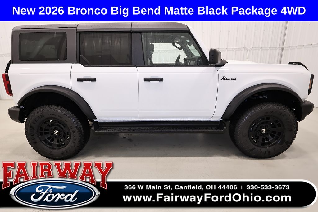 Fairway Ford Sells, Ships, And Collects Taxes In All 50 States***2026 Ford Bronco Base 4D Sport Utility 4WD 2.3L EcoBoost***Carbonized Gray Molded-in-Color Hard Top***Hard Top Sound Deadening Headliner***Trailer Tow Prep Package***Terrain Management System w/G.O.A.T. Modes: Normal, ECO, Sport, Slippery, & Sand***4X4 w/Part-Time Selectable Engagement***4.46 Axle Ratio***Hill Start Assist***Front Stabilizer Bar***HOSS 1.0***Trailer Sway Control***Roll Stability Control***Traction Control***Stability Control***Tow Hooks***Fender Tie-Down Hooks***Transmission Oil Cooler***16" Bright Polished Silver-Painted Steel Wheels***30" All Season Tires***Ford Co-Pilot360 Technology***Post-Collision Braking***Pre-Collision Assist w/Automatic Emergency Braking (Pedestrian Detection, Forward Collision Warning, Dynamic Brake Support)***Rear View Camera w/Backup Assist Grid Lines***Electric Brake Boost***Push-Button Start***Ford Connectivity Package (1-Year Included)***4G Modem***Ford App: Remotely Start, Lock & Unlock Vehicle, Schedule Specific Times To Remotely Start Vehicle, Locate Parked Vehicle, Check Vehicle Health Status, Activate Available Connected Service***12in. Touchscreen Radio w/SYNC 4***Wireless Phone Connection, Cloud Connected, 911 Assist, Wireless Apple CarPlay & Android Auto Compatible, Digital Owner's Manual, Conversational Voice Command Recognition***SiriusXM W/360L Trial Subscription***SiriusXM Listener Profiles w/"For You" Suggestions***Seven Speaker Sound System w/Subwoofer***Dual Smart Charging USB Ports***Tilt & Telescope Steering Column***Steering Wheel Mounted Cruise Controls & Audio Controls***Bluetooth Connectivity***Auto Start-Stop Technology***Electric Parking Brake***12in. IP Cluster Display: Message Center, Outside Temp Display, Trip Computer***Climate Control **Air Conditioning***Cabin Particulate Air Filter***Front & Rear Floor Liners w/o Carpet Floor Mats***Day/Night Rearview Mirror***Illuminated Entry System w/Courtesy Lamp Delay***Rear-Window Defroster & Washer***Center High-Mounted Stop Lamp***Auto Lock / Auto Unlock***Tool Kit For Removable Doors & Tops***Equipment Group 101A***Great Pricing, Selection, & Incentives On All New Broncos At Fairway!!! There truly is a difference when buying a New Vehicle at Fairway Ford. You are able to work with one person from start to finish as there is no need for back and forth negotiations. At Fairway Ford you will experience the most hassle free New Vehicle buying experience around. We have over 300 New Vehicles in stock. Come experience the Fairway buying experience. "Fairway That's The Way We Do Business." Price includes: $750 - Retail Customer Cash. Exp. 04/30/2026