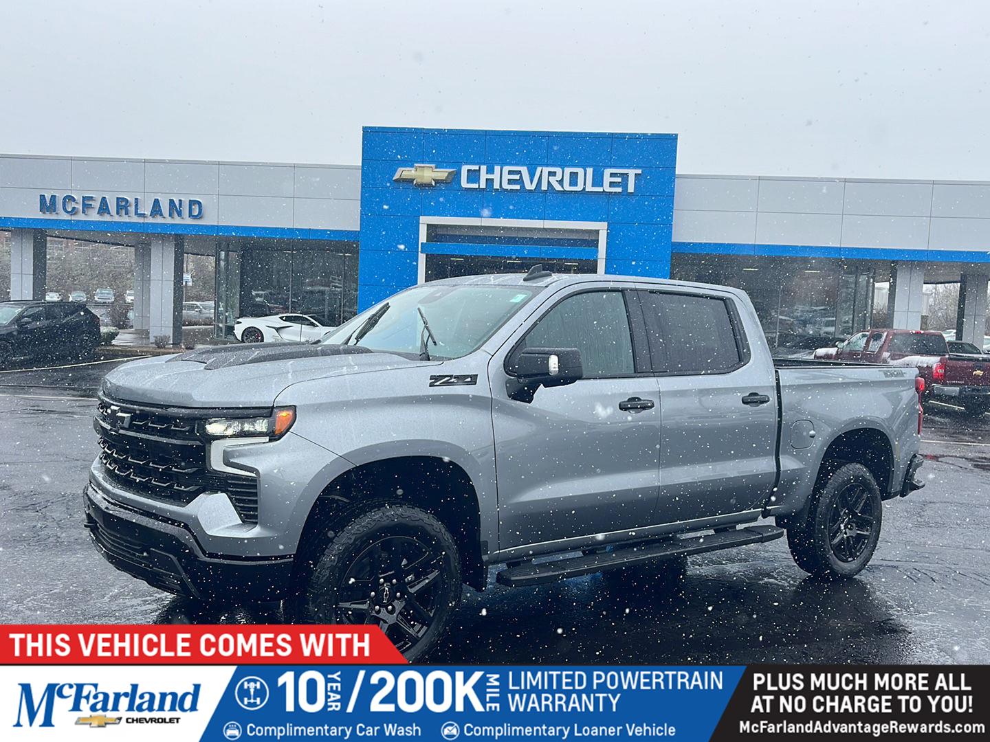 Engine, 6.6L V8 with Direct Injection and Variable Valve Timing, gasoline, (401 hp [299 kW] @ 5200 rpm, 464 lb-ft of torque [629 N-m] @ 4000 rpm)|Rear axle, 3.73 ratio|Durabed, pickup bed|GVWR, 10,650 lbs. (4831 kg) (Included and only available with CK20743 model and (L8T) 6.6L V8 gas engine with 18" or 20" wheels or CK20943 and (L8T) 6.6L V8 gas engine with 17" wheels.)|Air filter, high-capacity|Air filtration monitoring|Transfer case, two-speed electronic shift with push button controls (Requires 4WD models.)|Differential, heavy-duty locking rear|Four wheel drive|Cooling, external engine oil cooler|Cooling, auxiliary external transmission oil cooler|Battery, heavy-duty 720 cold-cranking amps/80 Amp-hr maintenance-free with rundown protection and retained accessory power (Included and only available with (L8T) 6.6L V8 gas engine.)|Alternator, 170 amps|Frame, fully-boxed, hydroformed front section and a fully-boxed stamped rear section|Suspension Package|Steering, Recirculating Ball with smart flow power steering system|Brakes, 4-wheel antilock, 4-wheel disc with DURALIFE rotors|Brake lining wear indicator|Capless Fuel Fill (Requires (L8T) 6.6L V8 gas engine.)|Wheels, 20" (50.8 cm) machined aluminum with high gloss Black painted accents, 10-spoke|Tires, LT275/65R20 all-terrain, blackwall|Tire, spare LT275/70R18 all-terrain, blackwall|Tire carrier lock keyed cylinder lock that utilizes same key as ignition and door|Bumper, front (High gloss black.)|Bumper, rear (High gloss black.)|CornerStep, rear bumper|BedStep, Black integrated on forward portion of bed on driver and passenger side|Moldings, beltline, Black|Cargo tie downs (12), fixed rated at 500 lbs per corner|Grille (Front grille bar with "CHEVROLET" painted body color. Includes body color surround and Black mesh inserts with small Gold bowtie emblem.)|Taillamps, LED with signature|Lamps, cargo area, cab mounted integrated with center high mount stop lamp, with switch in bank on left side of steering wheel.|Mirror caps, Black|Glass, deep-tinted|Tailgate and bed rail protection cap, top|Tailgate, locking, utilizes same key as ignition and door (Upgraded to (QT5) EZ Lift power lock and release tailgate when (PCX) Custom Convenience Package is ordered.)|Tailgate, gate function manual, no EZ Lift|Door handles, Black grained|Audio system feature, 6-speaker system|Seat adjuster, driver 4-way manual|Seat adjuster, passenger 4-way manual|Floor covering, color-keyed carpeting|Steering wheel, urethane|Steering column, Tilt-Wheel, manual with wheel locking security feature|Instrument cluster 6-gauge cluster featuring speedometer, fuel level, engine temperature, tachometer, voltage and oil pressure|Driver Information Center, 3.5" diagonal monochromatic display|Exterior Temperature Display located in radio display|Rear seat reminder|Window, power front, drivers express up/down|Cruise control, electronic with set and resume speed, steering wheel-mounted|Power outlet, front auxiliary, 12-volt|Mirror, inside rearview, manual tilt|Assist handles front A-pillar mounted for driver and passenger, rear B-pillar mounted|StabiliTrak stability control system with Proactive Roll Avoidance and traction control, includes electronic trailer sway control and hill start assist|Airbags, dual-stage frontal airbags for driver and front outboard passenger; Seat-mounted side-impact airbags for driver and front outboard passenger; Head-curtain airbags for front and rear outboard seating positions; Includes front outboard Passenger Sensing System for frontal outboard passenger airbag (Always use seat belts and child restraints. Children are safer when properly secured in a rear seat in the appropriate child restraint. See the Owner's Manual for more information.)|Hitch Guidance|Teen Driver a configurable feature that lets you activate customizable vehicle settings associated with a key fob, to help encourage safe driving behavior. It can limit certain available vehicle features, and it prevents certain safety systems from being turned off. An in-vehicle report card gives you information on driving habits and helps you to continue to coach your new driver|Tire Pressure Monitoring System with Tire Fill Alert (does not apply to spare tire)