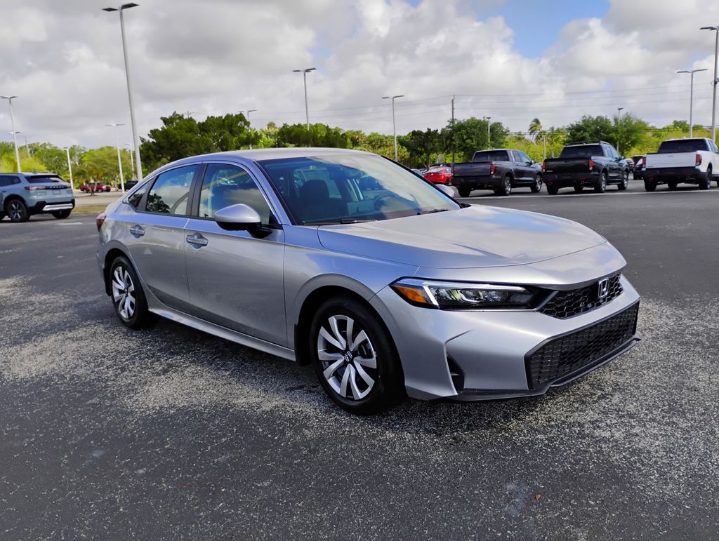Blk Clth Cloth. Platinum 2026 Honda Civic LX FWD CVT 2.0L I4 DOHC 16V 32/41 City/Highway MPG 32/41 City/Highway MPG Pictures are for illustration purposes only, and dealer is not responsible for printing errors. All vehicles are subject to prior sale. While we make every effort to ensure the data listed is correct, there may be instances where general site info,incentives options or vehicle features and prices may be listed incorrectly as we receive data from multiple sources. Please verify prices with a store manager or by visiting the dealership. Retail prices on our vehicles are obtained using multiple third party tools/sites and may change without notice. Our advertised price is based on market conditions and product demands. Prices are subject to change. Warranties will vary by vehicle. In-person, phone, text and email offers are not final until both parties have signed documentation. All payment offers are with approved credit. Listed APR, down payment, payments, incentives and other terms are estimates for example purposes only. Please see dealer for details. This vehicle comes equipped with Blk Clth Cloth, 4 Speakers, 4-Wheel Disc Brakes, ABS brakes, Adaptive Cruise Control: Adaptive Cruise Control (ACC) with Low-Speed Follow, Air Conditioning, AM/FM radio, Apple CarPlay/Android Auto, Auto High-beam Headlights, Automatic temperature control, Brake assist, Bumpers: body-color, Cloth Seating Surfaces, Delay-off headlights, Driver door bin, Driver vanity mirror, Dual front impact airbags, Dual front side impact airbags, Electronic Stability Control, Emergency communication system: HondaLink, Exterior Parking Camera Rear, Four wheel independent suspension, Front anti-roll bar, Front Bucket Seats, Front Center Armrest, Front reading lights, Fully automatic headlights, Illuminated entry, Knee airbag, Low tire pressure warning, Occupant sensing airbag, Outside temperature display, Overhead airbag, Panic alarm, Passenger door bin, Passenger vanity mirror, Power door mirrors, Power steering, Power windows, Radio data system, Radio: 160-Watt Audio System, Rear anti-roll bar, Rear side impact airbag, Rear window defroster, Remote keyless entry, Security system, Speed control, Speed-sensing steering, Steering wheel mounted audio controls, Tachometer, Telescoping steering wheel, Tilt steering wheel, Traction control, Trip computer, and Wheels: 16" with Full Covers . The price does not include tax, tag, license, an electronic filing fee of $449.00**, a private tag agency fee of $199.00**, and a predelivery service charge of $1199.00** **This charge represents costs and profit to the dealer for items such as inspecting, cleaning, and adjusting vehicles, as well as preparing documents related to the sale.* EPA-estimate metric: these are contingent on ideal conditions within a lab. Real-world situations such as carrying passengers or cargo, using climate control, driving style, and ambient temperatures can affect actual metrics.