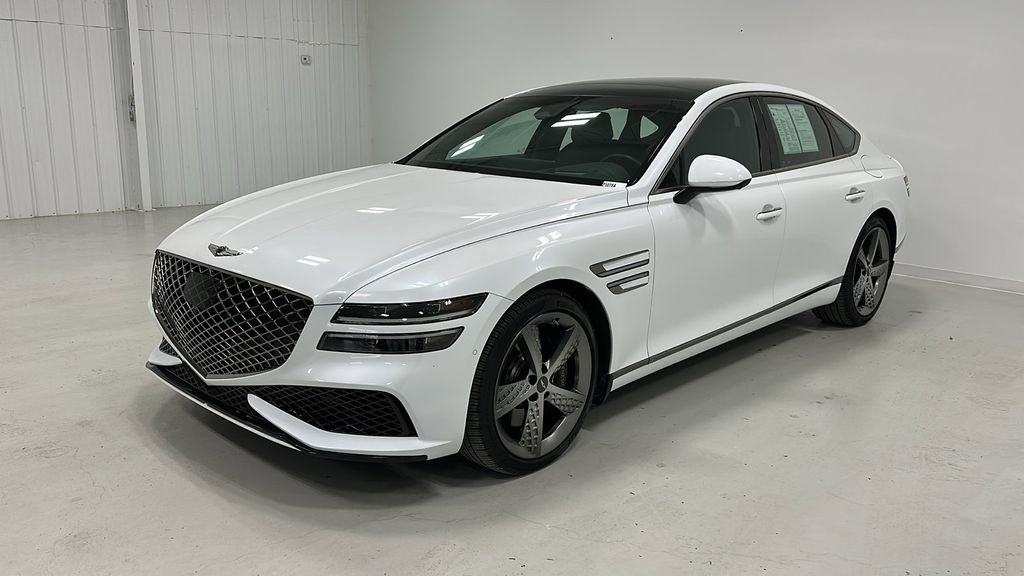 This 2024 Genesis G80 is equipped with Sport Prestige Package (12.3" 3D Digital Instrument Cluster, Carbon Fiber Trim, Electronically Controlled Suspension, Forward Attention Warning, Head-Up Display, Microfiber Suede Headliner & Pillars, Nappa Leather Seating Surfaces, Option Group 05, Rear Wheel Steering, Remote Smart Parking Assist, Reverse Parking Collision - Avoidance Assist, and Wheels: 20" Fr & 20" Rr Sport Alloy), Genesis Certified Certified, Navigation System, 12 Speakers, 4-Wheel Disc Brakes, ABS brakes, Adaptive suspension, Air Conditioning, Alloy wheels, AM/FM radio: SiriusXM, Android Auto & Apple CarPlay, Anti-whiplash front head restraints, Auto High-beam Headlights, Auto tilt-away steering wheel, Auto-dimming door mirrors, Auto-dimming Rear-View mirror, Automatic temperature control, Bumpers: body-color, Compass, Delay-off headlights, Driver door bin, Driver vanity mirror, Dual front impact airbags, Dual front side impact airbags, Electronic Stability Control, Emergency communication system: Genesis Connected Services, Exterior Parking Camera Rear, First Aid Kit, Four wheel independent suspension, Front anti-roll bar, Front Bucket Seats, Front Center Armrest, Front dual zone A/C, Front reading lights, Fully automatic headlights, Garage door transmitter: HomeLink, Heated & Ventilated Front Bucket Seats, Heated door mirrors, Heated front seats, Heated rear seats, Heated steering wheel, Illuminated entry, Knee airbag, Leather Seating Surfaces, Leather steering wheel, Low tire pressure warning, Memory seat, Mudguards, Occupant sensing airbag, Outside temperature display, Overhead airbag, Overhead console, Panic alarm, Passenger door bin, Passenger vanity mirror, Power door mirrors, Power driver seat, Power moonroof, Power passenger seat, Power steering, Power windows, Radio data system, Radio: AM/FM/HD/SiriusXM Audio System, Rain sensing wipers, Rear anti-roll bar, Rear reading lights, Rear seat center armrest, Rear side impact airbag, Rear window defroster, Remote keyless entry, Reversible Cargo Tray, Security system, Speed control, Speed-sensing steering, Speed-Sensitive Wipers, Steering wheel memory, Steering wheel mounted audio controls, Tachometer, Telescoping steering wheel, Tilt steering wheel, Traction control, Trip computer, Turn signal indicator mirrors, Variably intermittent wipers, Ventilated front seats, and Wheels: 19" Fr & 19" Rr Sport Alloy.