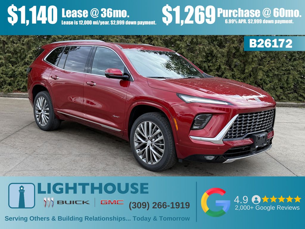 2.5L Turbo. All wheel drive. Sunroof, Apple CarPlay/Android Auto, Leather seats, Auto High-beam Headlights, Bose Premium 12-Speaker Audio System with Subwoofer, Front Bucket Seats, Front dual zone A/C, Head-Up Display, Heated Driver and Front Passenger Seats, Heated front seats, Heated steering wheel, Navigation System, Power Liftgate, Rear air conditioning, Remote keyless entry, SiriusXM with 360L Trial Subscription, Universal Home Remote, Adaptive cruise control, Following distance indicator, Forward collision alert, Traffic Sign recognition, Intellibeam, Automatic emergency braking, Rear cross traffic braking, Rear park assist, Blind zone steering assist, Lane keep assist, Lane departure warning, Front pedestrian & bicyclist braking, Reverse automatic braking, Safety alert seat, HD Surround Vision. Ask about the myBuick app for compatible smartphones. 3 yr/36,000 mile bumper to bumper warranty. 5 yr/60,000 mile powertrain warranty. We analyze the current market condition and re-price our vehicles on a daily basis; sometimes the price goes up and sometimes it goes down based on market values, supply and demand. At Lighthouse, we believe that value is more important than just price. Our goal is to offer competitive prices with exceptional customer service. Check our prices versus the competition, and if you find a lower price but prefer to do business with us, please reach out and give us an opportunity to earn your business. We will not compromise our exceptional customer service. Check out our reviews online. Read the biographies of our employees. You are more than just a number to us. Experience the Lighthouse difference. Our vision... "Serving others and building relationships... today and tomorrow." Price includes: $1250 - Buick GMC Bonus Cash. Exp. 04/30/2026 $500 - Buick & GMC Consumer Cash Program. Exp. 04/30/2026