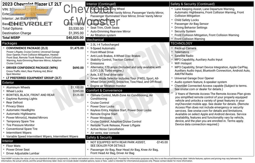 Driver Confidence Package,6 Speakers,6-Speaker Audio System Feature,AM/FM radio: SiriusXM,Premium audio system: Chevrolet Infotainment 3,Radio data system,Radio: AM/FM Stereo Audio System,SiriusXM Trial Subscription,Air Conditioning,Automatic temperature control,Rear window defroster,8-Way Power Driver Seat Adjuster,Power driver seat,Power steering,Power windows,Remote keyless entry,Steering wheel mounted audio controls,Traction control,4-Wheel Disc Brakes,ABS brakes,Dual front impact airbags,Dual front side impact airbags,Emergency communication system: OnStar One Essentials,Front anti-roll bar,Front wheel independent suspension,Low tire pressure warning,Occupant sensing airbag,Overhead airbag,Brake assist,Electronic Stability Control,Exterior Parking Camera Rear,Rear Park Assist,Auto High-beam Headlights,Delay-off headlights,Fully automatic headlights,Panic alarm,Security system,Adaptive Cruise Control,Speed control,Bumpers: body-color,Heated door mirrors,Power door mirrors,Spoiler,Compass,Driver door bin,Driver vanity mirror,Front and Rear Jet Black All-Weather Floor Liners,Front reading lights,Heated steering wheel,Illuminated entry,Lane Change Alert with Side Blind Zone Alert,Leather steering wheel,Outside temperature display,Overhead console,Passenger vanity mirror,Rear Cross Traffic Alert,Sport steering wheel,Tachometer,Telescoping steering wheel,Tilt steering wheel,Trip computer,Wireless Apple CarPlay/Wireless Android Auto,2-Way Adjustable Front Head Restraints,2-Way Power Driver Lumbar Seat Adjuster,4-Way Manual Front Passenger Seat Adjuster,Evotex Seat Trim,Front Bucket Seats,Front Center Armrest,Heated Driver and Front Passenger Seats,Heated front seats,Split folding rear seat,Passenger door bin,Alloy wheels,Wheels: 19" Black-Painted Machined Aluminum,Rear window wiper,Variably intermittent wipers,3.50 Final Drive Axle Ratio