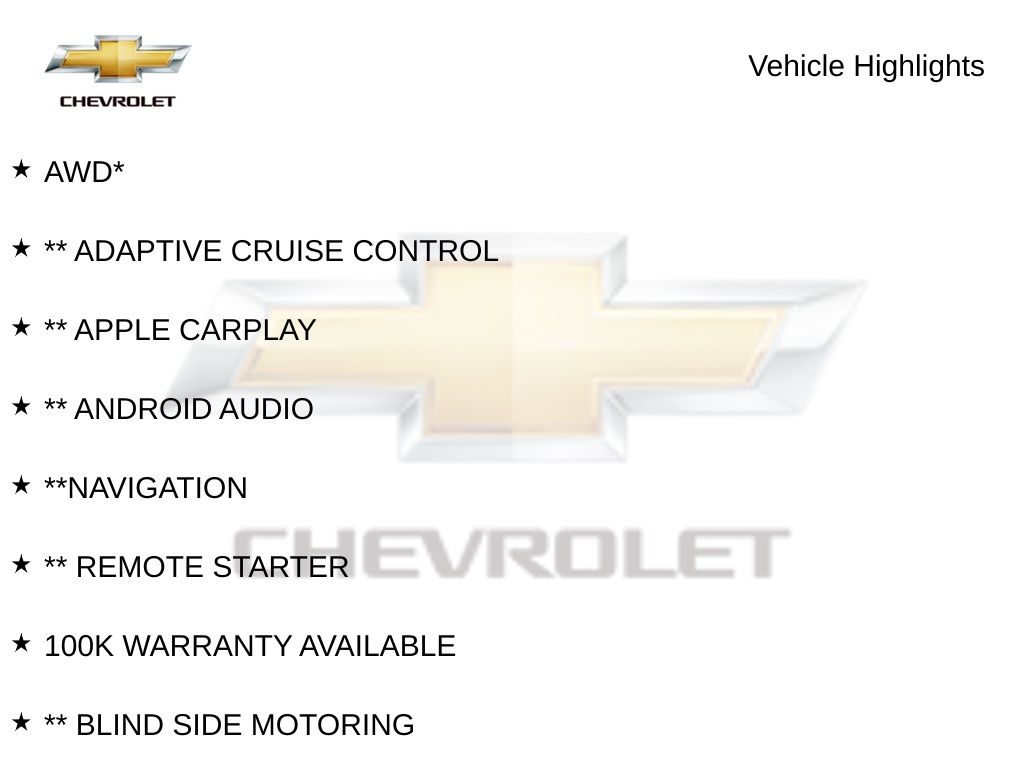 Driver Confidence Package,Driver Confidence Package II,Preferred Equipment Group 1FL,6 Speakers,6-Speaker Audio System Feature,AM/FM radio,Premium audio system: Chevrolet Infotainment 3,Radio data system,Radio: Chevrolet Infotainment 3 System,Air Conditioning,Rear window defroster,8-Way Power Driver Seat Adjuster,Power steering,Power windows,Remote keyless entry,Remote Vehicle Starter System,Steering wheel mounted audio controls,Four wheel independent suspension,Traction control,4-Wheel Disc Brakes,ABS brakes,Dual front impact airbags,Dual front side impact airbags,Emergency communication system: OnStar and Chevrolet connected services capable,Front anti-roll bar,Knee airbag,Low tire pressure warning,Occupant sensing airbag,Overhead airbag,Rear anti-roll bar,Rear side impact airbag,Brake assist,Electronic Stability Control,Exterior Parking Camera Rear,Rear Park Assist,Delay-off headlights,Fully automatic headlights,Panic alarm,Security system,Speed control,Bumpers: body-color,IntelliBeam Automatic High-Beam On/Off,Lane Change Alert w/Side Blind Zone Alert,Outside Power-Adjustable Body-Color Mirrors,Power door mirrors,Rear Cross Traffic Alert,Automatic Emergency Braking,Compass,Driver door bin,Driver vanity mirror,Following Distance Indicator,Forward Collision Alert,Front Pedestrian Braking,Front reading lights,Illuminated entry,Lane Keep Assist w/Lane Departure Warning,Outside temperature display,Overhead console,Passenger vanity mirror,Premium Cloth Seat Trim,Tachometer,Telescoping steering wheel,Tilt steering wheel,Trip computer,Voltmeter,Wireless Apple CarPlay/Android Auto,6-Way Manual Driver Seat Adjuster,6-Way Manual Front Passenger Seat Adjuster,Front Bucket Seats,Front Center Armrest,Power Driver Lumbar Control Seat Adjuster,Split folding rear seat,Passenger door bin,16" Aluminum Wheels,Alloy wheels,Variably intermittent wipers