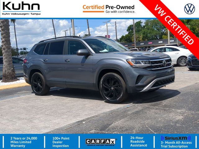 **VW CERTIFIED 2023 VOLKSWAGEN ATLAS 2.0T SE W/ TECHNOLOGY, TOURMALINE BLUE METALLIC EXTERIOR, TITAN BLACK LEATHER INTERIOR, 2.0L TSI TURBO 4-CYLINDER ENGINE, FWD 8-SPEED TIPTRONIC, PANORAMIC POWER SUNROOF, 2ND-ROW DUAL CAPTAINS CHAIRS, 20" BLACK ALLOY WHEELS, AUTO-DIMMING REARVIEW MIRROR W/ HOMELINK, MOJOMATS & TRUNK LINER, VW CARE PREPAID MAINTENANCE, PRIVACY COVER, FIRST AID & ROADSIDE ASSISTANCE KITS, ADAPTIVE CRUISE CONTROL STOP & GO, DIGITAL COCKPIT PRO, APP-CONNECT, BLUETOOTH, REAR VIEW CAMERA, KEYLESS ACCESS.** Odometer is 7710 miles below market average! Volkswagen Certified Pre-Owned Details: * Vehicle History * Model Year 2020 and Newer Vehicles: 2-Year or 24,000-Mile (whichever occurs first) Comprehensive Limited Warranty. Model Year 2019 Vehicles: 1-Year or 12,000-Mile (whichever comes first) Comprehensive Limited Warranty. Electric Vehicles Model Year 2019 & Newer: 3-Year or 36,000-Mile (whichever comes first) Comprehensive Limited Warranty. 2 Years of 24-Hour Roadside Assistance, Three Months of SiriusXM Platinum Plan Trial Subscription. * Warranty Deductible: $50 * Roadside Assistance * 100+ Point Inspection We Save You Time and Money Utilizing Internet Value Pricing! Our goal at Kuhn is to save you thousands on any vehicle in-stock by presenting market-based Internet Value Pricing. We do not artificially inflate our vehicle prices, attempting to win a negotiation contest with our guests. In short, we never play pricing games! Kuhn Automotive Group--Proudly serving the Greater Tampa Bay Area and beyond, including Saint Petersburg, Clearwater, Tarpon Springs, Safety Harbor, Brandon, Temple Terrace, Pinellas Park, Plant City, Largo, Lakeland, Orlando, and YOU! Call us today! (813) 872-4841.