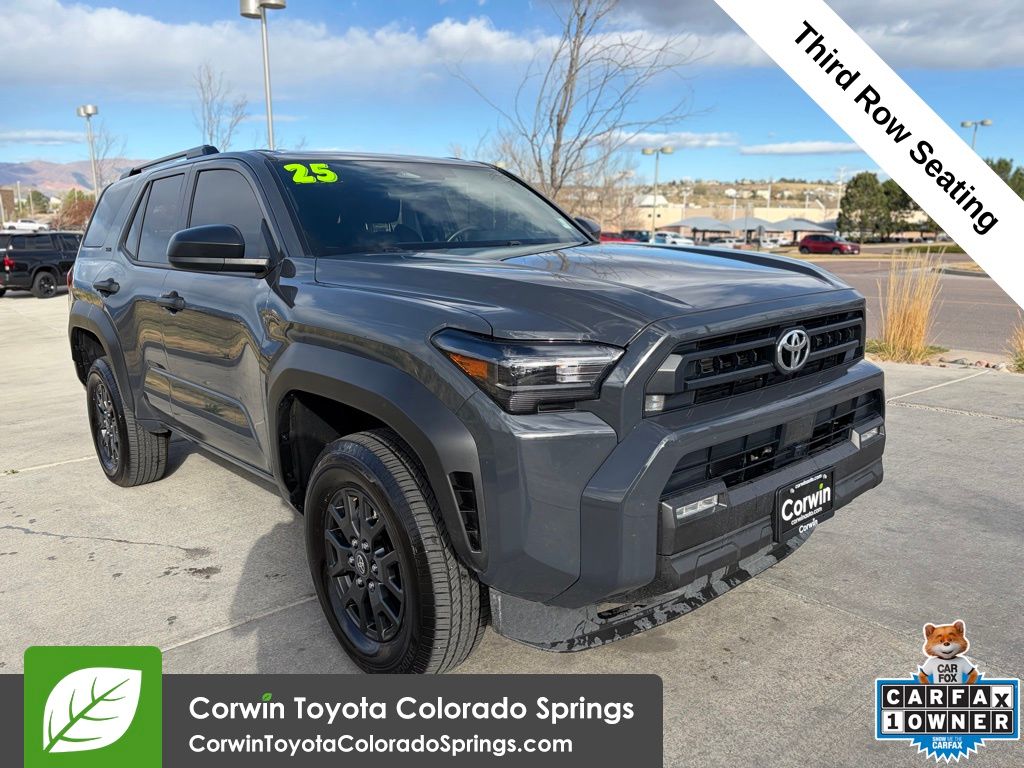 Discover the rugged versatility of the 2025 Toyota 4Runner SR5. This exceptional SUV combines off-road capability, advanced technology, and uncompromising safety to elevate your driving experience. - 17-in. dark-gray painted alloy wheels - Apple CarPlay® & Android Auto - 2.4L turbocharged inline 4-cylinder engine; 278 hp @ 6000 rpm; 317 lb.-ft. @ 1700 rpm - Third Row Seating - Toyota Safety Sense 3.0 Equipped with a powerful 2.4L turbocharged engine, the 4Runner SR5 delivers an impressive 278 horsepower and 317 lb-ft of torque, providing the muscle you need for any adventure. Paired with a smooth 8-speed automatic transmission and capable 4-wheel drive system, this SUV is ready to tackle the toughest terrain with confidence. Elevate your everyday drives and weekend getaways with the 4Runner's comprehensive suite of advanced technologies. Seamlessly integrate your smartphone with Apple CarPlay® and Android Auto, keeping you connected and entertained on the go. The 8-inch touchscreen audio system provides intuitive control over your music, navigation, and more, while the Toyota Safety Sense 3.0 suite offers a suite of advanced driver-assistance features to help keep you and your passengers safe. Versatility is at the heart of the 4Runner SR5, with available third-row seating that expands your passenger capacity. Whether you're transporting the whole family or loading up for an outdoor adventure, this SUV has the flexibility to adapt to your needs. Striking a perfect balance between rugged capability and refined comfort, the 2025 Toyota 4Runner SR5 is the ultimate companion for your next journey. Experience the difference for yourself and visit our showroom today to take this impressive SUV for a test drive.