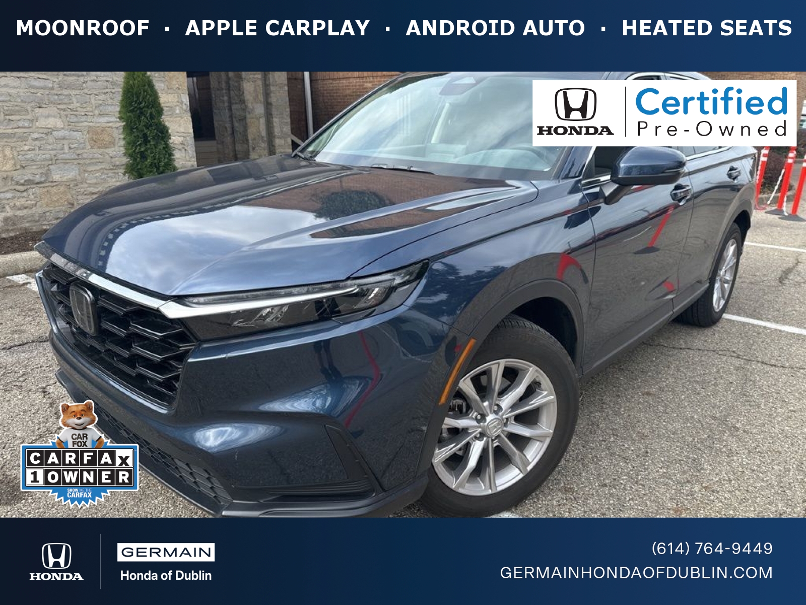 Notes on this vehicle: Honda Certified CARFAX 1 owner, Germain Honda of Dublin offers a free Carfax report with each car listed for sale on our website. DESIRABLE FEATURES: This popular Honda Certified 2023 CR-V EX features: MOONROOF, HEATED SEATS, ANDROID AUTO, APPLE CARPLAY, ALLOY-WHEELS, BLUETOOTH, BACKUP CAMERA, Remote entry, and is available today at our Dublin, OH Honda dealership near you. This Certified used 2023 all wheel drive Honda CR-V EX sports a head-turning Crystal Black Pearl exterior with a luxuriously-appointed Black Fabric interior and has only 29,852 miles. Stop by our Honda dealership near you today for a test drive! Certified Pre-Owned Honda: Choosing this Honda Certified 2023 Honda CR-V EX gives you peace of mind. That's because every Honda Certified Pre-Owned Vehicle goes through a rigorous multi-point inspection completed by one of our factory-trained technicians. In addition, each vehicle sold comes with great Honda benefits including: a limited warranty for powertrain and non-powertrain coverage, roadside assistance, complimentary oil changes in the first year of ownership, a 3-day vehicle exchange policy, Honda Care, trip interruption, concierge service, vehicle inspection reports, and Sirius XM for the first 3 months. This Honda certified 2023 CR-V passed a rigorous inspection of mechanical, electrical, and aesthetic details. For your safety and convenience, this vehicle comes fully detailed and sanitized. Warranties vary based on model year and mileage qualifications. See dealer for additional details. INTERIOR OPTIONS: Spoil yourself with refinement and reliability with your next Certified Honda, this 2023 Honda CR-V featuring: Automatic Climate Control, Heated Front Seats, Moonroof, Power Moonroof, Power Drivers Seat, Compass, Bucket Front Seats, Steering Wheel Audio Controls, Air Conditioning, Steering Wheel Cruise Control, Telescoping Wheel, Illuminated entry, Rear Reading Lights, Rear Seat Center Armrest, Multi-zone Climate Control, Steering Wheel Controls, Center Console Storage, Overhead Console, Tilt Steering Wheel, Rear Window Defroster, Reading Lights, Trip Odometer, Vanity Mirrors, Center Armrest, Split Folding Rear Seat, Outside Temperature Gauge. EXTERIOR OPTIONS: Enjoy the unparalleled attractive aesthetic of this Certified Honda, available at Germain Honda of Dublin. This 2023 Honda CR-V EX boasts: Alloy Wheels, Color Matched Bumpers, Headlight washers, Rear Window Wiper, Auto Headlamp, Spoiler. TECHNOLOGY FEATURES: Germain Honda of Dublin understands that the latest technology is essential to our customers. This 2023 Honda CR-V won't disappoint the tech-savvy, with advanced features including: Apple CarPlay Capable, Android Auto by Google, Bluetooth Connection, Keyless Entry. MECHANICAL FEATURES:This all wheel drive 2023 Honda CR-V SUV is offered factory-equipped with a capable 1.5l i4 dohc 16v engine, mated with a smooth cvt transmission. Other exciting installed mechanical features include: Heated Mirrors, Power One-touch down windows, Traction Control, Power Mirrors, Cruise Control, Ventilated Disc Brakes, Intermittent Wipers, Power Steering, Tachometer, Trip Computer, Variable Speed Intermittent Wipers. SAFETY OPTIONS: Our Ohio Honda dealership near you knows that safety is the most important factor. This Honda CR-V, like all of the Honda vehicles at our Columbus dealership, offers exceptional peace of mind. This 2023 CR-V EX keeps your family protected, with features like: Electronic Stability Control, Back-Up Camera, Integrated Turn Signal Mirrors, Adaptive Cruise Control, Brake Assist, Security System, Aftermarket Anti Theft System, Overhead airbag, ABS Brakes, Speed Sensitive Power Steering, Knee AirBag, Dual Air Bags, Tire Pressure Monitoring System, Auto Highbeams, Delay-off headlights, Passenger Air Bag Sensor, Driver Front Side Impact Air Bag. Need financing assistance? Looking for Certified Honda financing? Germain Honda of Dublin has all you need to obtain Honda financing. Our Columbus Honda dealer will wallk you through the entire car loan application process. Our Germain Honda of Dublin financial experts make it stress-free to apply for financing to purchase this certified 2023 Honda CR-V for sale. Germain Honda of Dublin is the perfect Honda dealer for customers near Columbus, Marysville, Delaware, and the neighboring Ohio communities. Our Honda dealership near Dublin believes you deserve everything you want. That's why at Germain Honda of Dublin, you'll never have to choose between performance and value. Germain Honda of Dublin offers this Certified 2023 Honda CR-V EX for sale today at our Honda dealership in Columbus, Ohio. We also carry an additional 98 models in stock today at our Honda dealership near you! Germain Honda of Dublin is always ready to buy or trade for your used car, truck, or SUV, so don't forget to explore trade-in deals at our Columbus Honda dealer! Our Honda Dealership: Call Germain Honda of Dublin today at (614) 388-8510 to schedule a test-drive appointment for this Certified 2023 Honda CR-V EX! Germain Honda of Dublin serves Columbus, Marysville, Delaware, and the neighboring Ohio communities. Visit our local Honda dealer at, 6715 Sawmill Rd. Dublin OH, 43017 to get a better look in person! You're sure to appreciate the unrivaled inventory at our Honda dealership near you! Our Honda dealer near you works hard to be as accurate as possible with our vehicle listings & descriptions. We kindly ask that you verify equipment, mileage & pricing with a client advisor prior to purchasing. Pricing is subject to change without notice. *From the original in-service date of the vehicle.